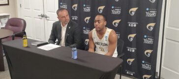 Senior guard Kadyn Dawkins of the Anderson University Trojans answers post game questions from the media and head coach Jimmie Williams looks on. Dawkins led the team with 21 points in a three point upset loss to Young Harris College.