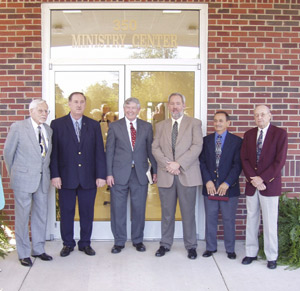 Oak Grove Baptist Church, Spartanburg, dedicated its new 5,000-square-foot ministry center and celebrated the church’s 155th anniversary Oct. 30. Cutting the ribbon are (l to r) Henry Pruitt, longest church member; Danny Knight, chairman of the building committee; Rufus Chaneyworth, pastor; Terry Phillips, chairman of deacons; George Feris, general contractor with TN Construction; and Ed Garren, second longest church member.