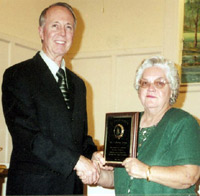 Reedy River Baptist Association honored Catherine Young for 39 years as associational pianist during its annual meeting. Presenting the plaque is Kenneth Harmon, pastor of First Baptist Church, Newberry.