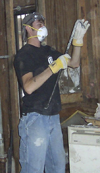 Tearing away – Walls were stripped down to the bare studs to be redone.The group worked with First Baptist Church, New Orleans, to help families clean out their storm-ravaged homes in preparation for rebuilding. They divided into two teams that spent Monday through Thursday hauling off ruined personal belongings and tearing out carpet, sheetrock, insulation, plumbing, appliances, and furniture.