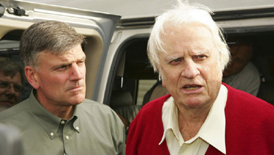 Franklin and Billy Graham make a stop in the devastated Lower Ninth Ward of New Orleans, which was flooded by up to 10 feet of water after Hurricane Katrina.