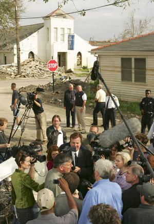 Amid New Orleans’ ongoing struggles with Hurricane Katrina’s devastation, Franklin Graham speaks to the media in the Lower Ninth Ward.