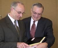 Newly elected NAMB chairman Bill Curtis, left, of Florence, talks with the Mission Board’s interim chief operating officer, Carlos Ferrer, at the trustees’ May 2 meeting in Jersey City, N.J.Trustees of the North American Mission Board met May 2, their first meeting since the resignation of NAMB president Bob Reccord. The board approved 74 new missionaries and 63 SBC-endorsed chaplains, elected new officers and approved a resolution expressing appreciation for Reccord’s term of service.
