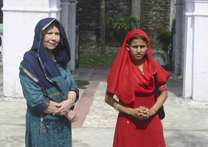 Elaine Hall, left, stands with a Muslim woman in the courtyard of a mosque. Because they were females, they were not allowed to enter and had to cover their heads and remove their shoes just to be in the courtyard.