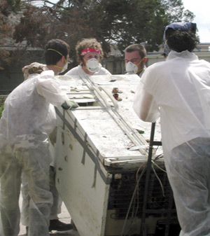 Students from Corban College in Salem, Ore., remove a rancid refrigerator while gutting a New Orleans-area home. “I just held my breath and walked fast,” said Josh Bronson. “We’re here to serve the Lord, and if that means hauling a putrid refrigerator to the street, that’s what we’ll do.”Before Katrina, there were 140 Southern Baptist congregations; now there are about 85, and several of those are merging or worshipping together.