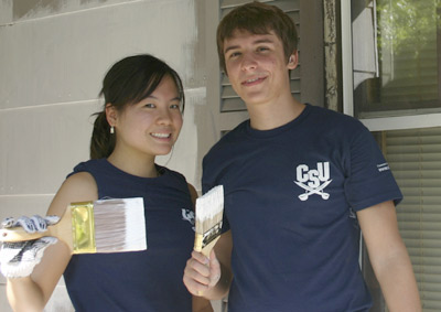 Student body president Grace Kim and vice president Michael Whitsitt work with several other crews painting a home in Summerville.