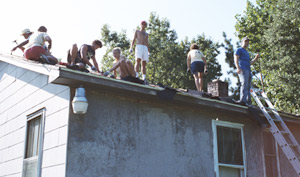A group of CSU students and Summerville Baptist volunteers spend Xtreme Makeover “up on the roof.”