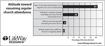 LifeWay Research found more than two-thirds of formerly churched adults are open to the idea of attending church regularly again.