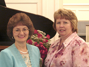 Brenda Sanders, left, and Sherry Smith were recently recognized by Eureka Baptist Church, Anderson, for a combined total of more than 70 years service to the church. Sanders has been pianist since 1969, and Smith has served as organist since 1971. Both have been members of Eureka since childhood. They have rarely missed a morning and evening service or Wednesday night practice, said Dave McKee, minister of music.