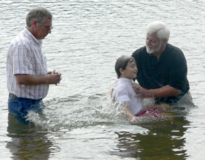 During the annual church picnic at High Falls Park in Oconee County, Ken Reid, pastor of College Street Baptist Church, Walhalla, conducted an outdoor baptism service in Lake Jocassee. Assisted by Michael Oakley of the baptism committee, Reid baptized Elijah Leap, son of Ed and Jan Leap.