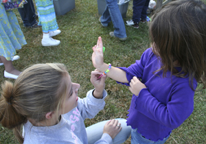 Ally Baker, Baptist Campus Ministries service director at Charleston Southern, admires a young girl’s “new jewelry” at the block party.