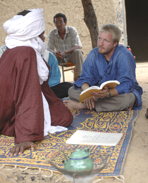 Journeyman Nate Gunter strikes up a conversation with a Tuareg man in Niger. In keeping with African culture, Gunter spends many afternoons drinking tea and talking with other villagers.