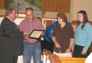 Todd Montgomery, second from left, was licensed to the ministry Oct. 8. Terry Corder, pastor of Mt. Pisgah Baptist Church, Kershaw Baptist Association, presented the certificate. With Montgomery are his wife Sharon and daughter Kristin.