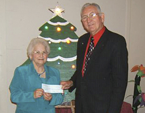 Emma Lee Fincher, director of the WMU for Padgett’s Creek Baptist Church, Union, stands with pastor Carrol Caldwell beside the lighted Christmas tree that represents the Lottie Moon Christmas Offering received by the church. Each light bulb represents $25, displaying the church’s goal of $1,200. The goal was exceeded by more than $800, for a total of $2,070.