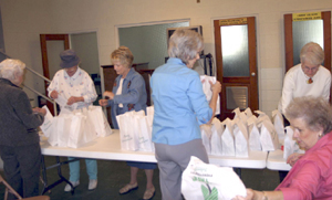 Members of “Sewing for Missions” of First Baptist Church, St. Matthews, are shown bagging some of the 257 caps made for seafarers who dock in Charleston. Last year, they also made 88 caps for children in Paytona, W.Va.; 251 personal hygiene bags for seafarers; 250 medicine bags for a medical team in South America; and 50 turbans for cancer patients in Orangeburg.