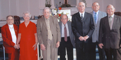 Charter members of West Gantt First Baptist Church, Greenville, were recognized on Family Day, Nov. 19. The first sermon was preached in the church on April 1, 1946, with 115 people in attendance and an offering of $283. From left are Micky McWhite, Mina Fulp, Jack James, Paul Lindsey, Billy James, Bill McWhite, and Welborn McWhite.