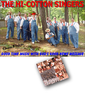 The Hi-Cotton Singers are an all-male part-time singing group from Springfield, S.C., that enjoys praising the Lord through song. The group originated at Pleasant Hill Baptist Church. Although none claim to be professional singers, the men really cause a congregation to join in the worship experience. By using a variety of music styles including standard gospel favorites, country gospel, original music and a healthy smattering of good news blues, the group appeals to all ages. Basing their ministry on the fact that you don’t have to be anyone special to do work for Jesus the men share their faith as “ordinary, unschooled men – who have been with Jesus” (Acts 4:13). For purchasing and scheduling information, visit www.hi-cottonsingers.com.