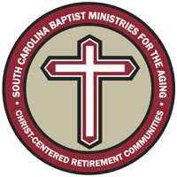 The words “South Carolina Baptist Ministries for the Aging” and “Christ-Centered Retirement Communities” are set in white letters within a red field circumscribing the cross.