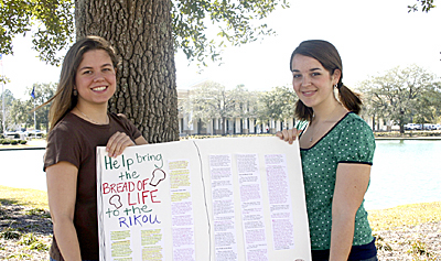 Ashley Williams, left, and Katie Young hold a poster displaying the 100 verses to be translated into the Rikou language. A verse was highlighted for every $20 received.In January, the two girls attended the Passion conference in Atlanta. During the event, a speaker shared about One Verse, an organization that translates the New Testament into the native language of unreached people groups for $20 a verse. Holding up what appeared to be a Bible, he flipped through the blank pages, explaining that many people do not have a Bible they can read. The empty pages spoke volumes to Ashley and Katie. “They haven’t heard the gospel at all,” said Ashley, a junior church music major and member at Rehoboth Baptist Church in North Charleston. “They have no idea it even exists.”