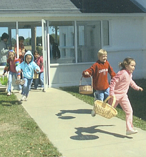 Hoping to get a jump on finding the prize egg, these youngsters from Nebo Baptist Church in Britton’s Neck bound from the breezeway. Leading the pack is Logan Williams, followed by Walt Richardson, Katie Allen and Bailee Cribb. Christy Everett is director of children’s activities. The event was held Saturday morning before Easter. Refreshments followed the egg hunt.