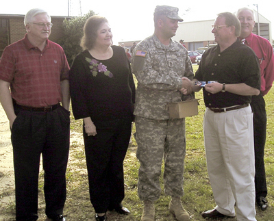 The 29 churches of Union County Baptist Association provided phone cards for Union County National Guardsmen who are being deployed to Afghanistan. The WMU supplied the unit with snack bags for their trip to Mississippi. Sgt. First Class Lonnie Wilbanks receives the first 155-minute phone. Making the presentation are Bill Harris, director of missions; Aulbrey Calvert; Larry Padgett, pastor of Hebron Baptist Church; and Marilyn Bright, WMU director.