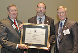 Walter Johnson, dean of the College of Christian Studies at North Greenville University, was recognized by South Carolina Independent Colleges and Universities at its second annual Excellence in Teaching awards banquet April 17 at the Columbia Metropolitan Convention Center in Columbia. During the banquet, SCICU awarded the 2007 Excellence in Teaching Award to faculty members from its 20-member schools who have exhibited the qualities and skills most desired for enabling student learning. With Johnson, center, are George Acker, president of the SCICU board, left, and Jimmy Epting, NGU president.