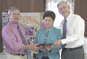 Betty Jean Fallaw was honored April 15 by Philippi Baptist Church, Johnston, for more than 50 years of service to the church’s music ministry. During the morning service, she was presented a music box and a plaque that will be displayed in the fellowship hall. Fallaw has served as pianist, organist, assistant pianist, and choir member. She retired as pianist this year, but she continues to serve as an assistant pianist and sings in the choir. Pictured below are (l to r) Robert Fallaw, Betty Jean Fallaw, and pastor Mayhew West.