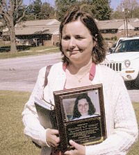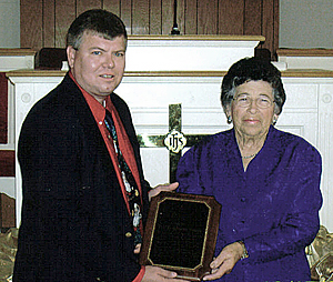 Magdalene Smoak was honored last December by Mt. Tabor Baptist Church, Bowman, for 57 years of service as a Sunday school teacher. Presenting a plaque of recognition is Raymond Dukes, Sunday school director. Smoak has now entered a new ministry in her life: sharing the gospel in song.