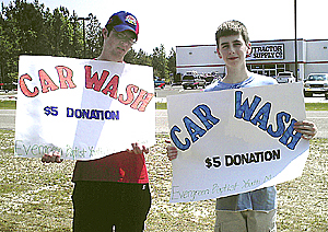 The youth of Evergreen Baptist Church, Effingham, have been busy raising funds for their summer mission trip to Copperhill, Tenn. They had an indoor yard sale May 5 and held a car wash May 12. Chris Owens and Damon Earp took their turns holding signs promoting the car wash. Tina Suggs and Sherri Owens are youth directors for Evergreen.