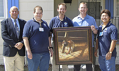 Dedication for the new seafarers center in Charleston was held May 22. A house that was part of the transfer of property when the Charleston Baptist Association moved its offices was remodeled to be used as the center. It will serve crew members from ships docking at ports on the Cooper River in Charleston and North Charleston. Holding a picture that was a gift from the South Carolina Baptist Convention are (l to r) DOM Edgar Boles, port chaplain Chris Dale, special ministries coordinator Gary Mathis, SCBC mobilization strategist Tim Rice, and port chaplain Youngki Kim.