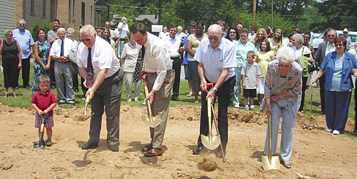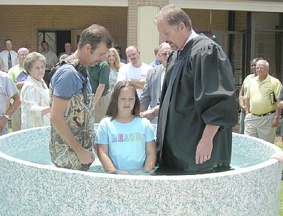 Emerald Baptist Church, Greenwood, broke ground (above) June 24 for a 13,500-square-foot fellowship hall and classroom facility. The $750,000 structure, which will also contain a full stage and baptismal pool, is expected to be completed by December 2007. Participating in the groundbreaking are (above, l to r) Joshua Penson, trustees Jimmy Owensby and Wayne Whatley, and oldest members Clayton Devore and Verlin Hummer. For the past two years, the church has used a portable outdoor baptismal pool and has baptized more than 70 people. Below, minister of youth Jerry Eidson assists pastor Curtis Eidson (black robe) with a baptism.