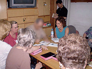 A Chinese pastor (features blurred for security), who has suffered greatly for his faith and convictions, autographs a book about his life for the women on the trip.When we entered his house, we were hot and tired. I thought it was a restaurant; people were coming and going all the time. It was the most amazing church – with pews, video cameras, Bibles, tapes, and a baptismal pool as well. I was amazed at the number of printed materials that this man had to distribute, as well as the number of people who heard his message every week – up to 3,000! Then I wondered if what I had seen in the Middle East in Jordan might also be true here.