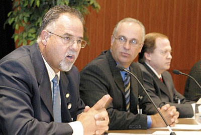Tim Patterson, left, chaired NAMB’s FamilyNet task force, which recommended that NAMB’s board of trustees approve a plan to sell FamilyNet to In Touch Ministries of Atlanta. Also pictured are Bill Curtis, center, chairman of NAMB’s board of trustees, and Geoff Hammond, NAMB president.Under terms of the letter, NAMB and In Touch Ministries will work together to evaluate and negotiate the planned sale and purchase of FamilyNet, and finalize details for the sale on or before Oct. 31, 2007.