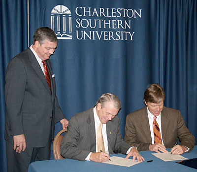 At left, Mohler observes CSU president Jairy Hunter Jr., and East Cooper Baptist Church pastor Buster Brown signing into establishment the “East Cooper Baptist Church Intern Scholarship.” Each student intern will receive a $1,000 scholarship per semester.