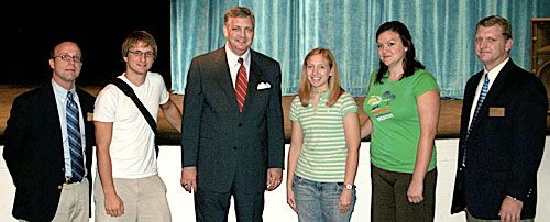 Southern Baptist Seminary president Al Mohler talks to Charleston Southern University faculty, staff and students about the role of learning in Christianity Sept. 10. With Mohler, center, are (l-r) chair of the religion department Keith Sharp, religion major Alex Kaufman, psychology and religion double major Megan Qualls, psychology and religion double major Joy Miller, and professor Jesse Adkinson.