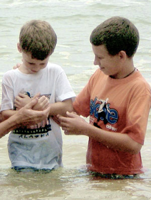 Cody*, 13, right, helps his father baptize his younger brother, Peter*, 6, in the Indian Ocean.During training to serve in his role as strategy coordinator, Greg Cargill*, a former pastor in South Carolina who now serves in South Asia with the International Mission Board, practiced using a newly learned evangelistic tool with his children.