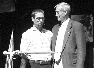 Missionary Coley Mull, left, presented NGU president Jimmy Epting with a sword, representing NGU’s involvement and emphasis in missions.The McCaskill Fero conference room in the Tingle Student Center was transformed into a “global village,” where the visiting missionaries set up display tables showing what part of the world they served and how they ministered to the people.