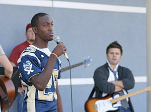 Youth Alive was held Oct. 20 at Charleston Southern University. Activities of the annual event included praise and worship time led by Jonathan Phillips and his band from North Spartanburg First Baptist Church. Personal testimonies were given by Richard Thom, a Liberty University football player, and freshman CSU football player C.J. Dancy. Dancy, pictured at right, shared about a severe injury he received during a home game and the emergency surgery which “saved his life.” The CSU vs. Liberty game followed lunch.