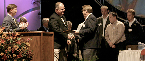 Gary Hensley (left), Christian Life and Public Affairs Committee, read the citation to pastor Clay Smith (second from left), who accepted the award from Robert Dickard, chairman of CLPAC. The entire staff of Alice Drive came on stage for the presentation.Within the past year, 65 adults and youth from Alice Drive ministered locally and abroad in Mamelodi, South Africa, and in East St. Louis, Mo., building homes and ministering to the urban poor.