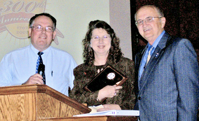 Debbie Wieland was recognized as Mission Service Corps Missionary of the Year for South Carolina during York Baptist Association’s annual meeting. With her are Mike O’Dell, left, director of missions, and moderator Tom Patterson, pastor of Woodhaven Baptist Church.