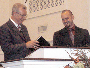 Daniel Royster, right, was ordained to the ministry Nov. 4 by Eureka Baptist Church, Anderson, where he is minister of youth and children. He and his wife Caitlin have one son, Pierce, and are expecting a second son, Cole, in February. Royster’s first baptism was his son, Pierce. Presenting a Bible in honor of Royster’s ordination is pastor Ron Fousek.