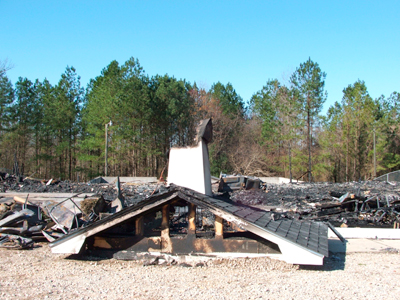 The fire totally destroyed the church building and all of its furnishings. The shed next to the building did not burn, and the basketball goal was still standing. A large cross and small cross located on the front of the church were also spared.