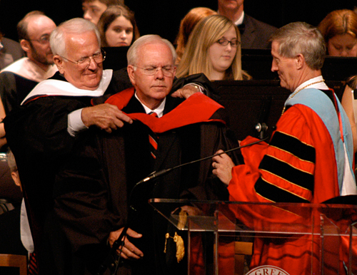 At the conclusion of his address, Freeman was presented with an honorary doctor of Christian leadership degree, awarded by NGU president Jimmy Epting and board of trustees chairman Don Ward.