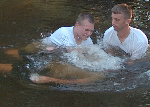 Frankie Tanner (in first picture, at left), pastor of Mechanicsville Baptist Church, Darlington, conducted baptism for five people May 25. Jacob Heatherly (in second picture, at right) Mechanicsville’s youngest preacher-in-training, assists in the May 26 baptism of J.C. Pearson, which was held in Black Creek.