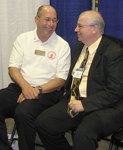 Wilson Nelson of North Greenville University and Paul Fleming, vocational evangelist from Greenville, enjoy a light moment in the exhibit hall at the SBC annual meeting in Indianapolis.