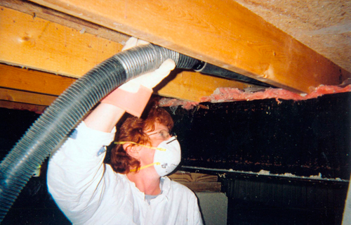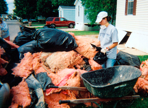 Marijon Ellison stuffs water-soaked home insulation into trash bags for pick-up.In Columbus, Samaritan’s Purse was supported by two local churches. Columbus Free Methodist Church (Ann’s former church) was used for meals and lodging, and Columbus Community Church served as the headquarters for the tool van and as the place where the work orders were issued to the volunteers for their service assignment for the day.