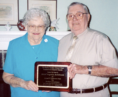 Virginia and Ed Bellebaum were presented a plaque recognizing them for 51 and 54 consecutive years of perfect attendance in the Talley Sunday School Class of Summerville Baptist Church, Screven Baptist Association.