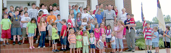 Children and youth at Fairview Baptist Church, Spartanburg, recite pledges to the Christian and American flags during Vacation Bible School.