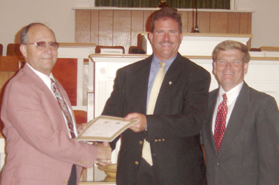 James Wiles, center, was ordained to the ministry June 29 by Mt. Tabor Baptist Church, Bowman. Wiles, a graduate of Andersonville Theological Seminary, is interim pastor of Hunt’s Memorial Baptist Church, Easley. Retired pastor Bobby Etheridge, right, was head of the ordination council and preached the ordination sermon. With them is Wiles’ father James.