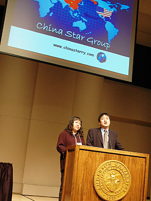 Chao Jiang, president of China Star and official of the ministry of education of China, speaks to the attendees at the Consortium on Global Education Conference with the aid of an interpreter.The Consortium for Global Education, or CGE, partners Baptist universities with colleges in other countries for meaningful exchanges of cultures, instruction and ideas. Not only did the South Carolina Baptist universities – Anderson, Charleston Southern and North Greenville – participate in the Anderson meeting, but Baptist universities such as Baylor, Samford, Missouri Baptist, California Baptist, Union, and Dallas Baptist participated as well. This was the first time the organization has held its annual conference in South Carolina.